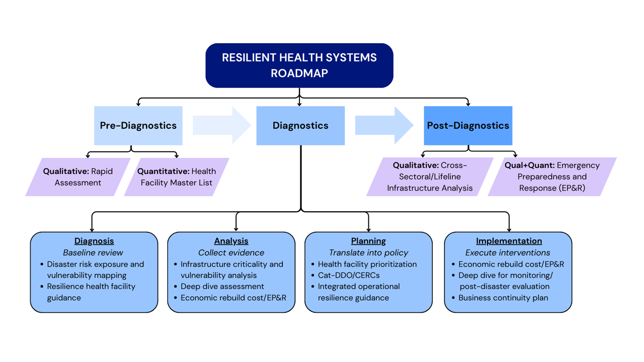 The Roadmap for Resilient Health Systems (RRHS) is a step-by-step guide to help governments strengthen health systems to withstand and respond to crises. Consisting of three main phases [pre-diagnostics, diagnostics (diagnosis, analysis, planning, implementation), and post-diagnostics], it provides tools to identify vulnerabilities, prioritize measures, and invest in resilient services. By linking health systems with lifeline infrastructure, the roadmap supports policymakers in moving from reactive crisis management to proactive resilience building—ensuring essential care continues during emergencies and protecting long-term development gains. We are in the process of finalizing the detailed roadmap but below is a quick snapshot.