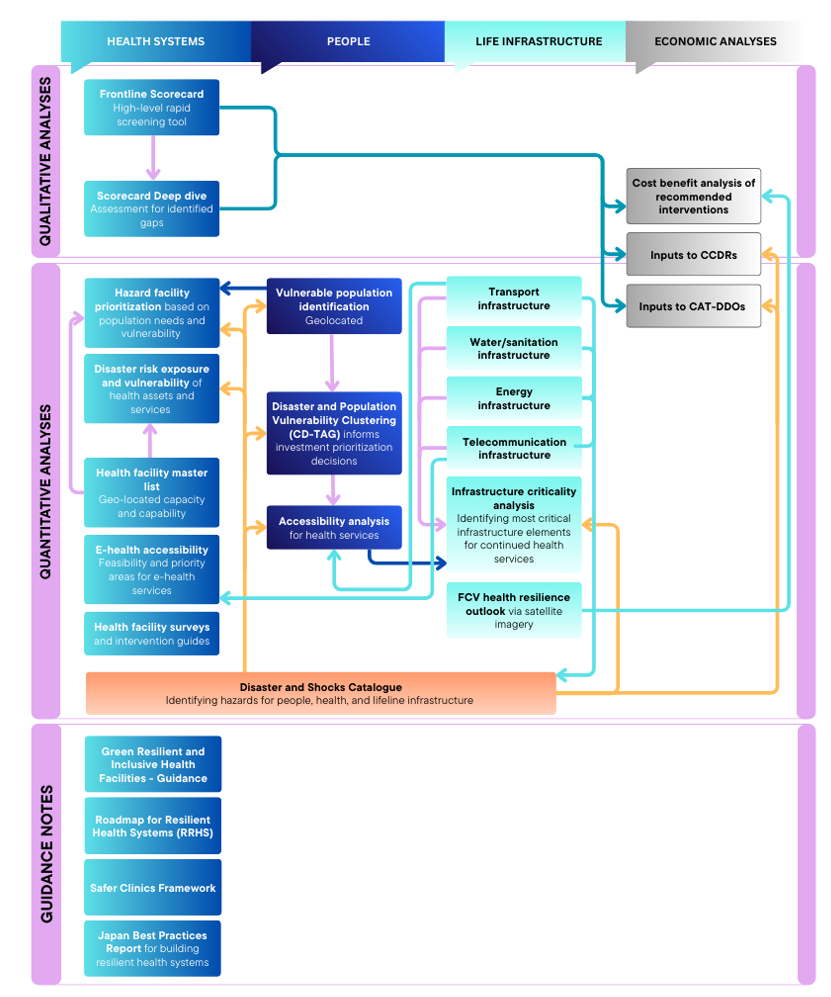 The Frontline Scorecard is the World Bank Group’s country baseline rapid assessment tool that gauges a country’s health system resilience to natural hazards (disasters) and shocks. Policy makers can use the scorecard as a systematic screening tool to identify focus areas for investment in building more resilient health systems and strengthening their disaster risk management (CDRM) capabilities. The scorecard consists of 80+ individual (mix of quantitative and qualitative) indicators across four pillars of facilities, systems, response, and infrastructure. The indicators cover multiple categories from codes and regulations, physical assets, information systems, to public communications, to name a few. Final scores are stoplight based (“red,” “yellow, “green”), making it easier to spot strengths and existing gaps. Depending on the size and complexity of the country’s health system, along with data availability, it can take anywhere from one week to a month to conduct the assessment. Results can help to identify existing gaps, target specific in-depth analyses, and inform investment operations, including instruments like the World Bank's Catastrophe Deferred Drawdown Options (CAT DDOs), as well as contribute to Country Climate and Development Reports (CCDRs).