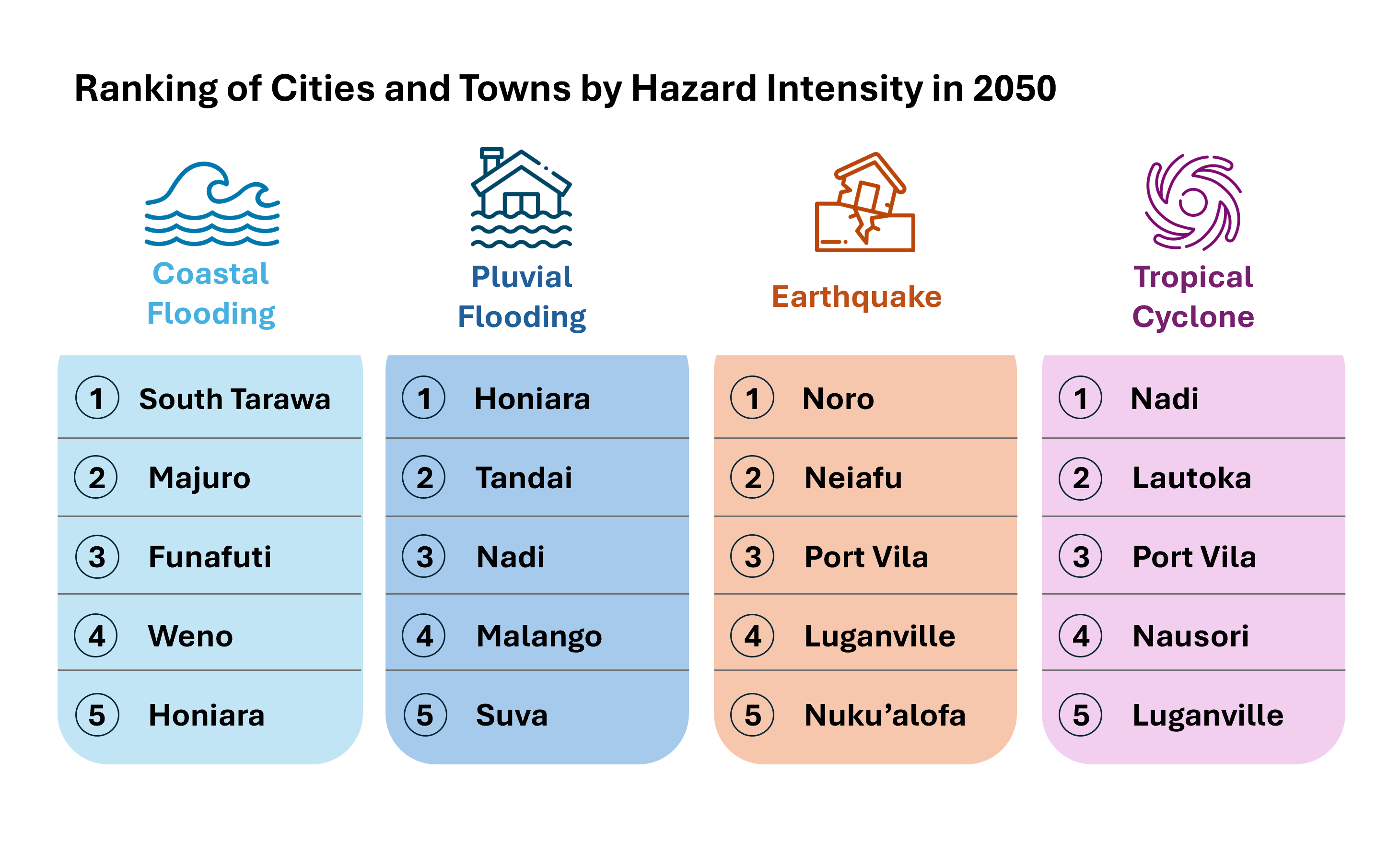 Cities are exposed to hazards in different ways. This ranking reflects relative hazard intensity in 2050. Adapted from: Mapping Risk, Building Resilience – Exposure Analysis of Pacific Urban Areas. World Bank, 2026.