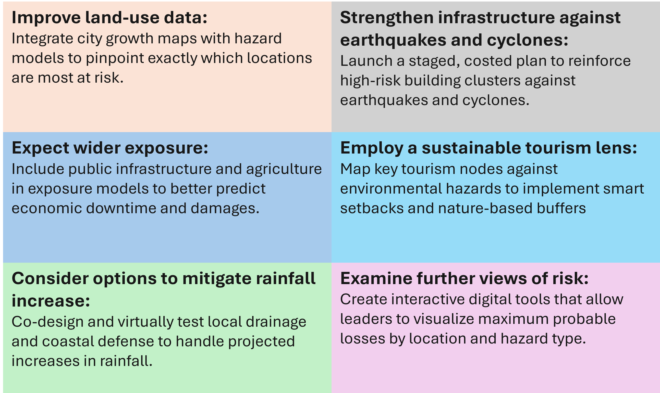 Practical steps for governments and cities working to reduce exposure and future disaster losses are highlighted in the table below.