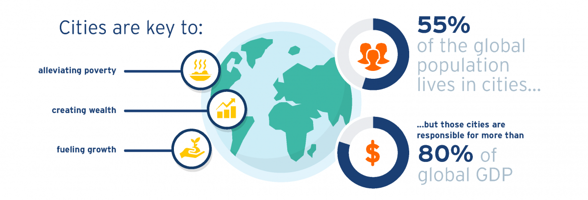 Home to 55 percent of the world’s population, cities contribute an astounding 80 percent of global GDP. So it’s good news for the global economy that cities are exploding in size. Each year, urban areas are growing by an average of more than 75 million people – greater than the population of the world’s 85 smallest countries combined.