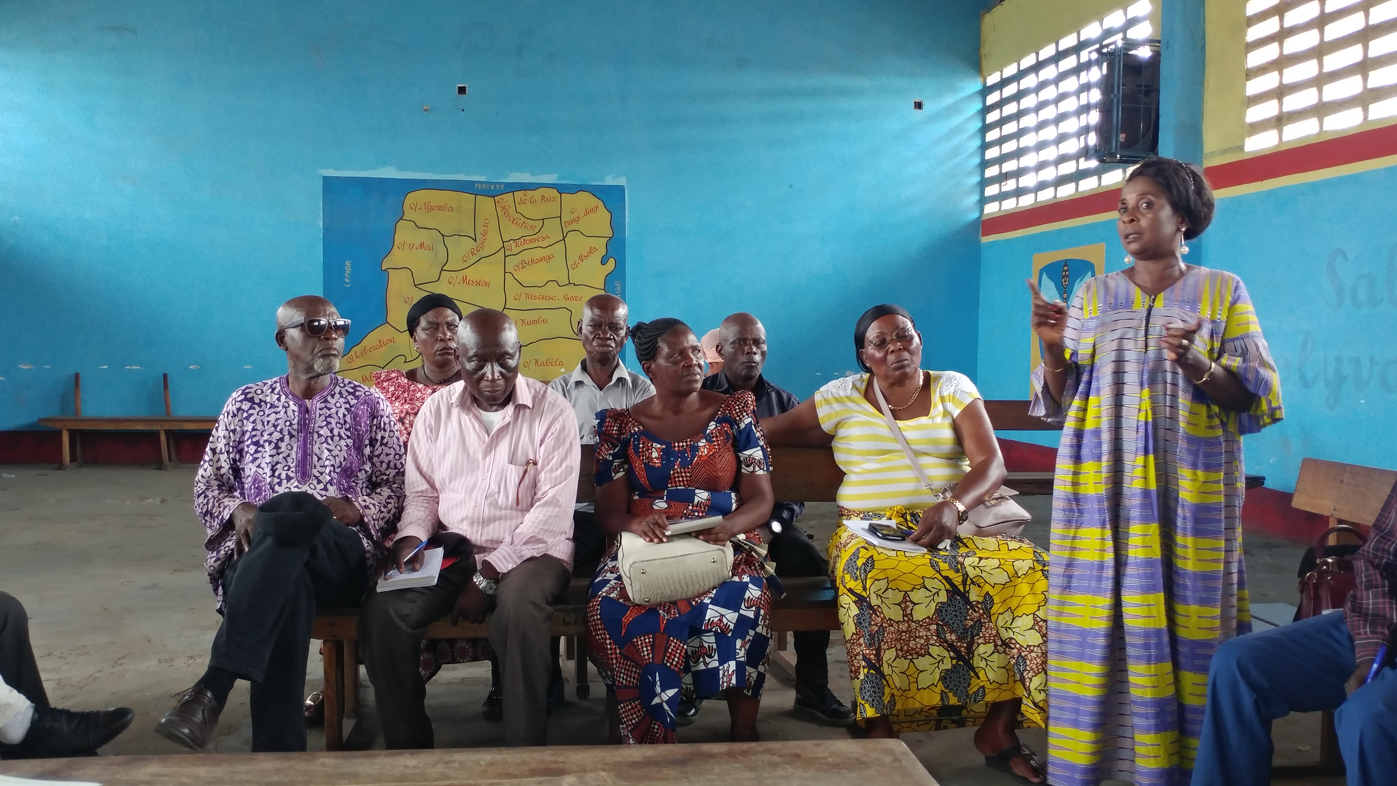 President of Delapaix neighborhood Ms. Pay Pay describes flooding issues at a community engagement event in Kinshasa, Democratic Republic of Congo. (Photo Credit: OSFAC)
