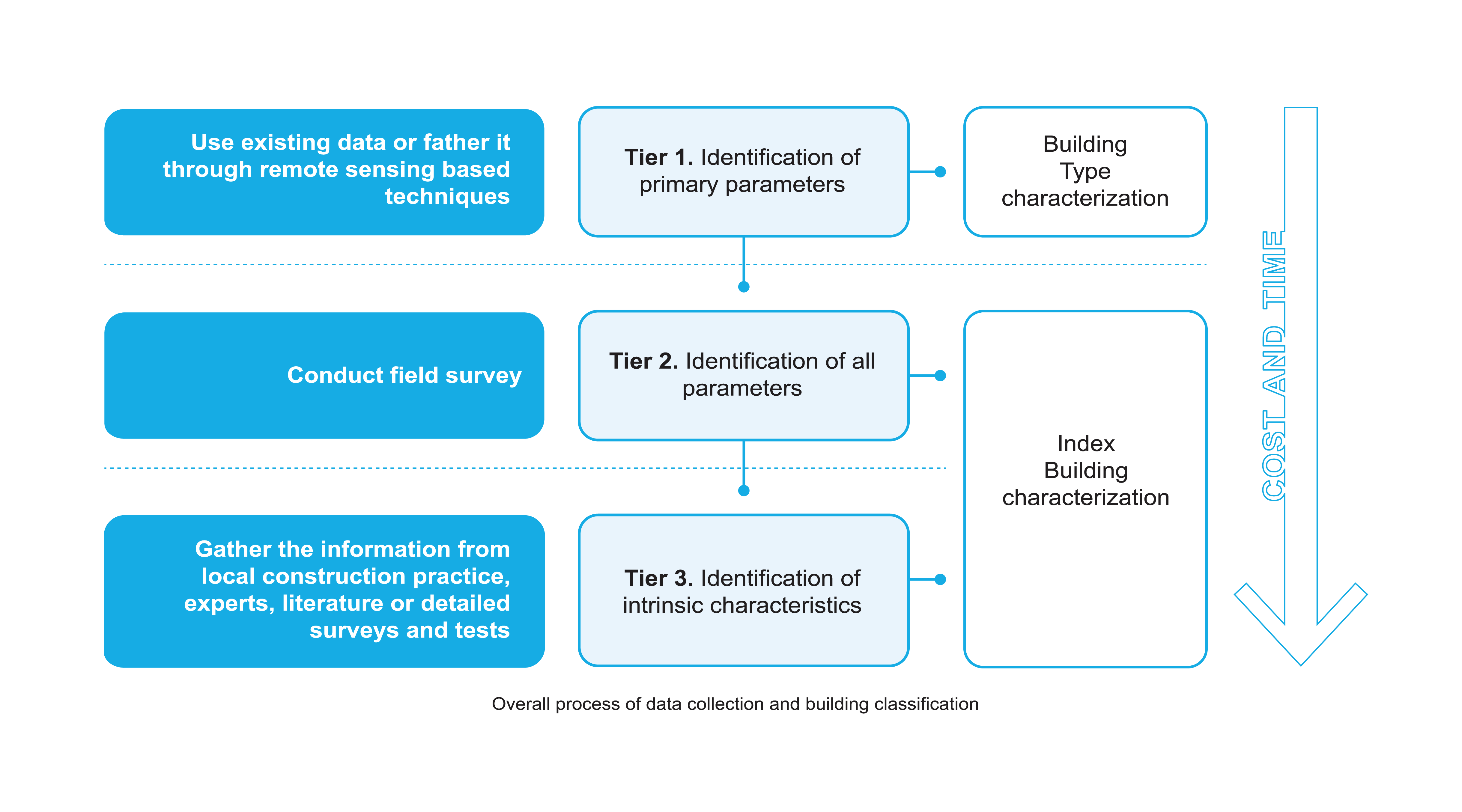 - Tier 3: the objective of Tier 3 is to collect all the detailed information to perform a reliable fragility/vulnerability assessment for specific cases. This Tier includes the collection of the intrinsic characteristics of building types, which specifically refers to geometric dimensions, mechanical properties of material and structural details. Detailed assessments are usually required, such as destructive tests to know the internal reinforcement details or non-destructive tests to establish material properties. Also, detailed analysis using numerical models are often necessary.