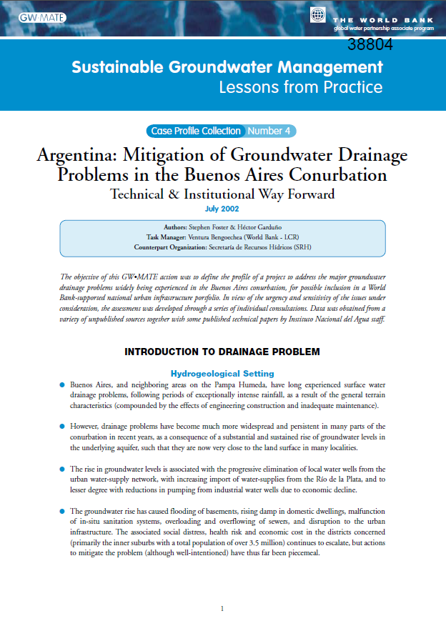 Argentina: Mitigation of Groundwater Drainage Problems in the Buenos Aires Conurbation: Technical and Institutional Way Forward