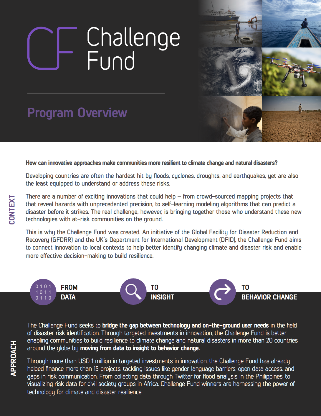 This document provides a brief overview of the Challenge Fund program - a special initiative of the Global Facility for Disaster Reduction and Recovery (GFDRR) and the UK’s Department for International Development (DFID) that seeks to bridge the gap between technology and on-the-ground user needs in the field of disaster risk identification.