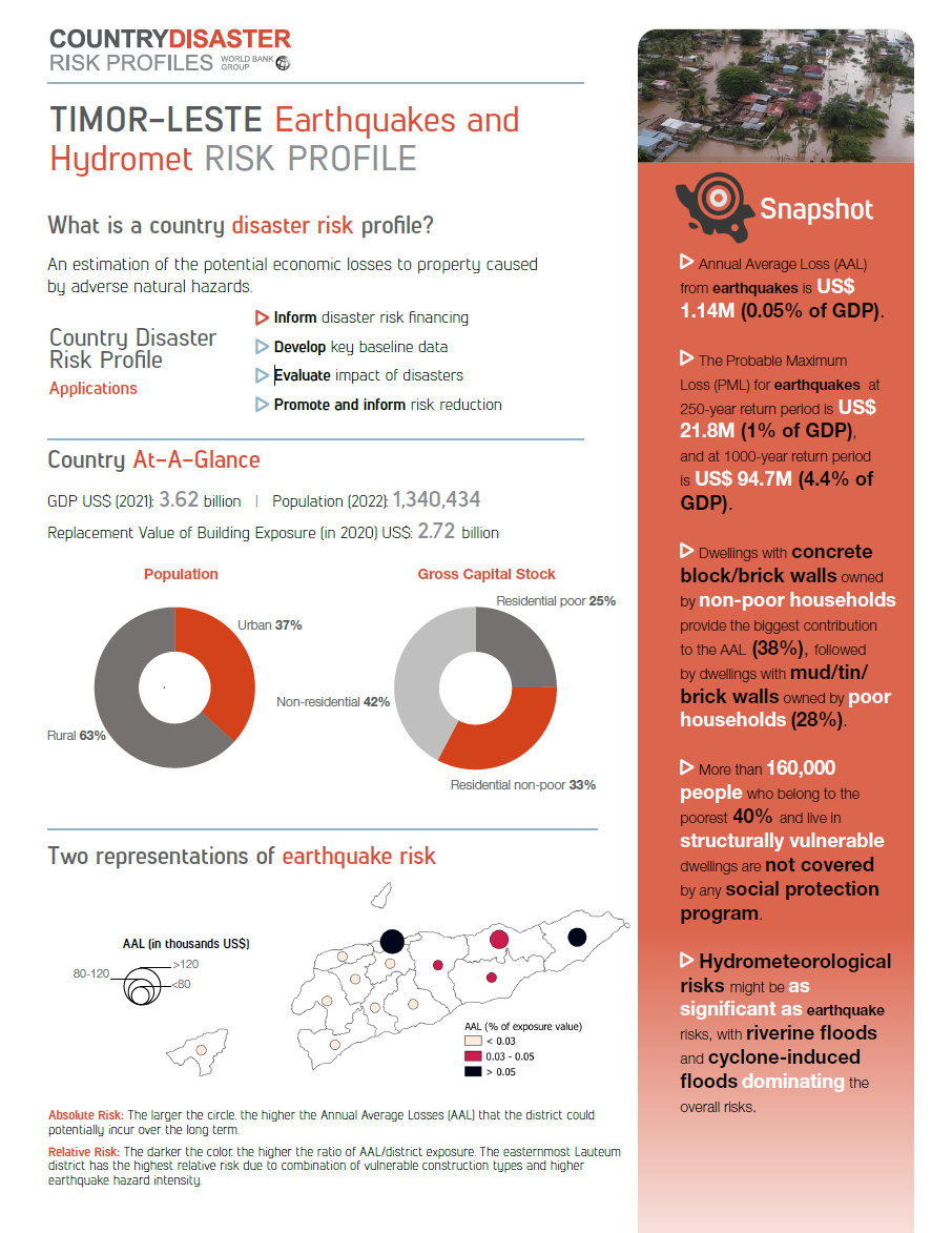 This profile provides an estimation of the potential economic losses to property caused by adverse natural hazards in Timor-Leste. It finds that hydrometeorological risks might be as significant as earthquake risks, with riverine floods and cyclone-induced floods dominating the overall risks.