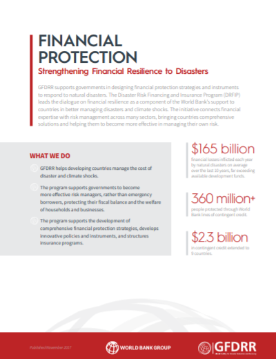 GFDRR supports governments in designing financial protection strategies and instruments to respond to natural disasters. The Disaster Risk Financing and Insurance Program (DRFIP) leads the dialogue on financial resilience as a component of the World Bank’s support to countries in better managing disasters and climate shocks. The initiative connects financial expertise with risk management across many sectors, bringing countries comprehensive solutions and helping them to become more effective in managing their own risk.