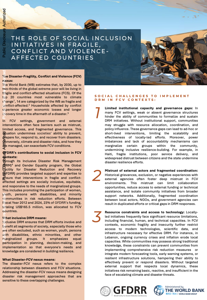 This factsheet underscores the importance of social inclusion in Disaster Risk Management (DRM) across Fragile, Conflict, and Violence (FCV) contexts, where the World Bank projects that up to two-thirds of the global extreme poor may live by 2030. Its objective is to guide equitable, locally responsive DRM interventions that address the intersecting disaster–FCV nexus, in which conflict magnifies disaster impacts and deepens vulnerability for marginalized groups. Key portfolio insights show that the Global Facility for Disaster Reduction and Recovery (GFDRR) allocated 165.5 million dollars, 23 percent of its funding, to FCV countries between FY2012 and FY2024 to advance inclusive DRM. Persistent challenges include constrained institutional capacity, limited trust in external actors, severe resource and data gaps, and difficulties integrating modern technologies with traditional knowledge systems. The factsheet recommends four complementary, locally led strategies: enabling community involvement in planning; targeted capacity building for vulnerable groups and local institutions; empowering communities through ownership mechanisms; and inclusive strategic integration that embeds social inclusion across DRM policies and operations. Case examples from Myanmar, Haiti, Republic of the Congo, and Yemen illustrate how these measures can strengthen trust, leverage local knowledge, and improve the effectiveness and sustainability of DRM in complex FCV environments.