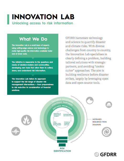 GFDRR harnesses technology and science to quantify disaster and climate risks. With diverse challenges from country to country, the Innovation Lab specializes in clearly de ning a problem, building tailored solutions with strategic partners, and avoiding “cookie cutter” approaches. The aim is building resilience before disaster strikes, largely by leveraging open data and open source tools.