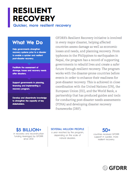 GFDRR’s Resilient Recovery initiative is involved in every major disaster, helping affected countries assess damage as well as economic losses and needs, and planning recovery. From typhoons in the Philippines to earthquakes in Nepal, the program has a record of supporting governments to rebuild lives and create a safer future through resilient recovery. The program works with the disaster-prone countries before events in order to enhance their readiness for post-disaster recovery.