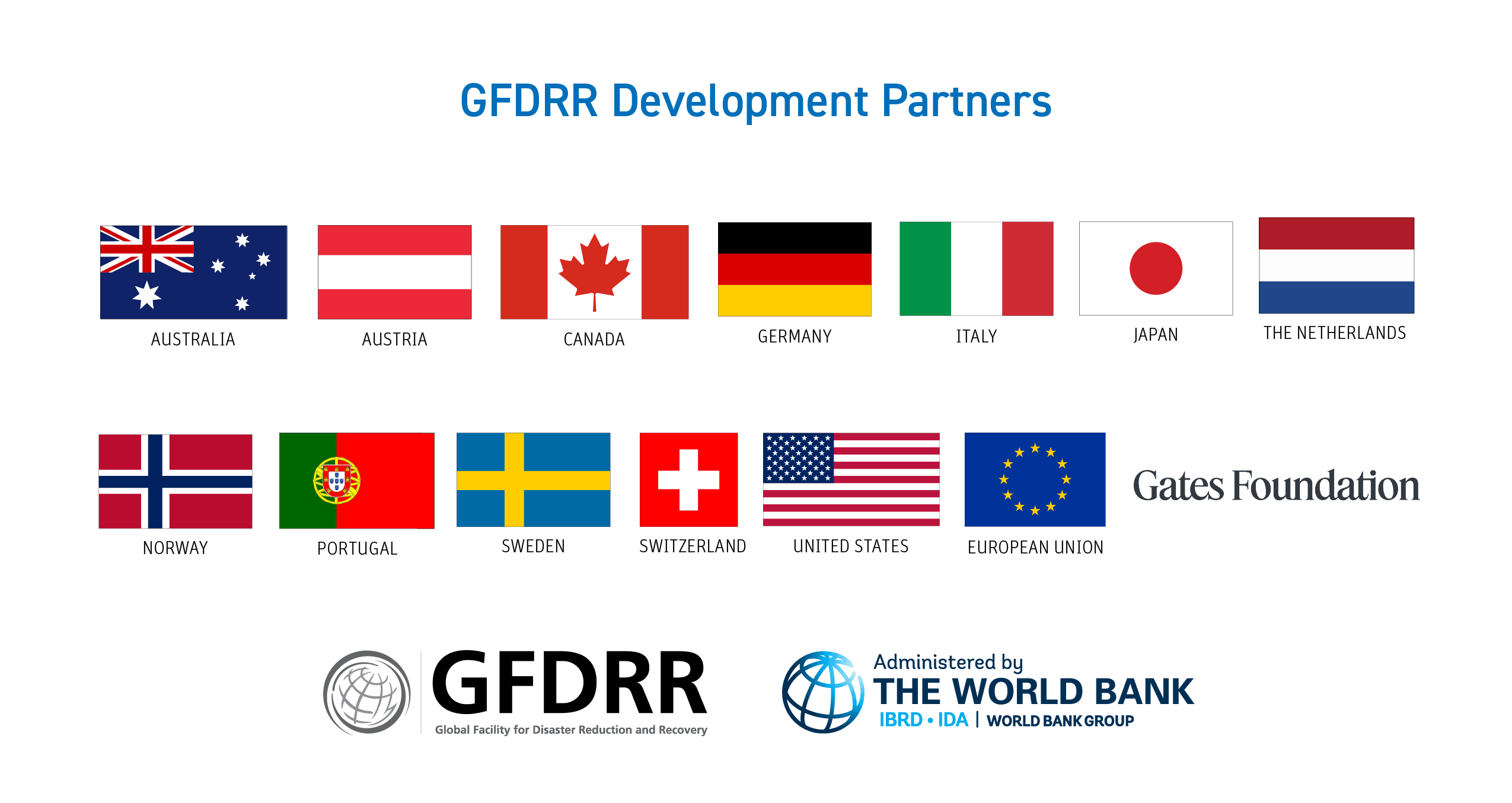 GFDRR, together with the World Bank Group, works with various partners on disaster risk management, including leading universities, the insurance sector, the risk-modeling industry, civil society organizations, foundations, technical and development agencies of national governments, the United Nations, and other multilateral institutions. Development partners contributing to the core of GFDRR’s work are (in alphabetical order) Australia, Austria, Canada, European Union, Gates Foundation, Germany, Italy, Japan, the Netherlands, Norway, Portugal, Sweden, Switzerland and the United States.